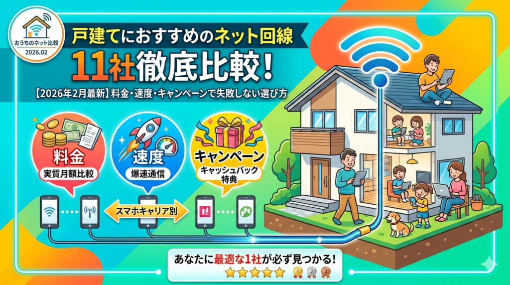 【2026年2月最新】戸建てにおすすめのネット回線11社を徹底比較!料金・速度・キャンペーンで失敗しない選び方 戸建てのネット回線選びで迷っているなら、結論は「スマホキャリアに合わせた光回線を、実質月額で比較して選ぶ」のが正解です。2026年2月時点... -