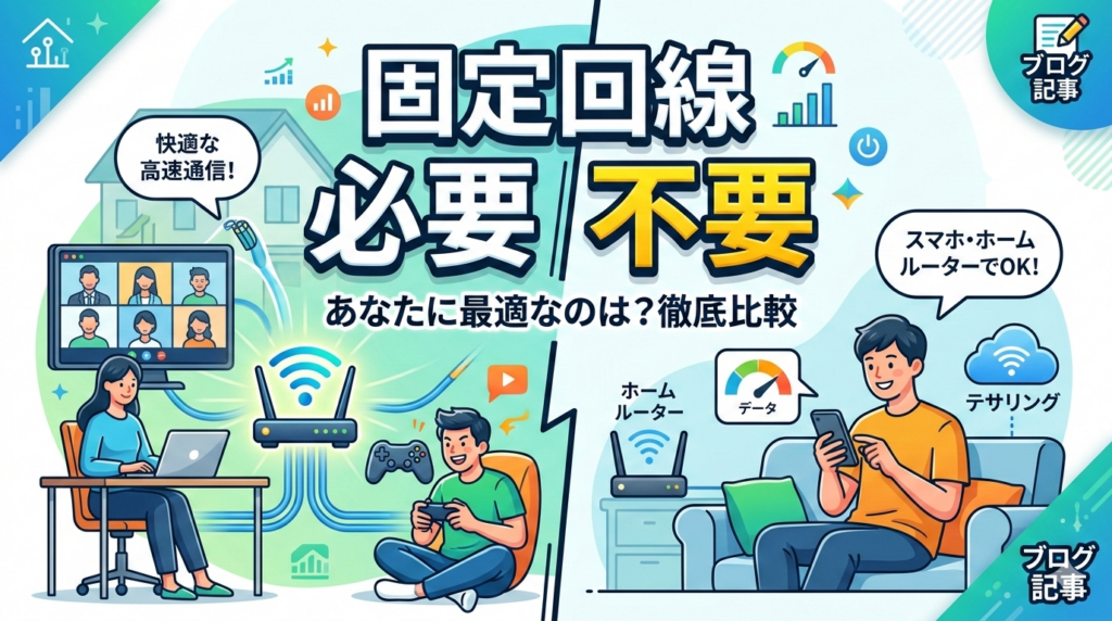 固定回線(光回線)が自分に必要か不要か、迷っていませんか。結論から言えば、テレワークやオンラインゲーム、家族での同時接続が多い方には固定回線が必要ですが、一人暮らしで外出が多くスマホ中心の方にはホームルーターやテザリングで十分なケースも... -