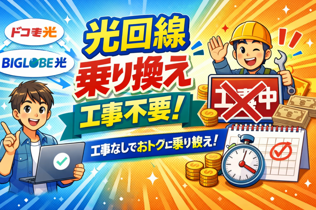 光回線の乗り換えは「工事が必要で面倒くさい」と思っていませんか?実はフレッツ光から光コラボへの転用、または光コラボ同士の事業者変更なら、工事ゼロ・最短数日で乗り換えが完了します。2026年3月現在、ドコモ光・BIGLOBE光などのキャッシュバックキ... -