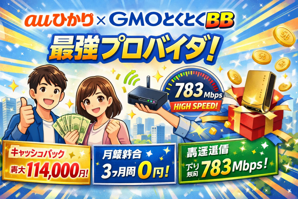 auひかり×GMOとくとくBBは最強プロバイダ?料金・速度・キャッシュバックを徹底解説【2026年3月最新】 auひかりのプロバイダ選びで迷っているなら、結論から言うとGMOとくとくBBが最もおすすめです。最大114,000円の高額キャッシュバック、3ヶ月間の月額料... -