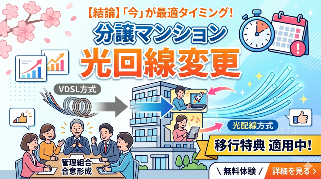 【結論】分譲マンションの光回線変更は「今」が最適タイミング 2026年1月31日、NTT東日本・NTT西日本は光配線方式が併設されている建物でのVDSL/LAN配線方式のサービス提供を終了しました。NTT東日本では2026年2月28日までの移行申請+7月31日までの工事... -