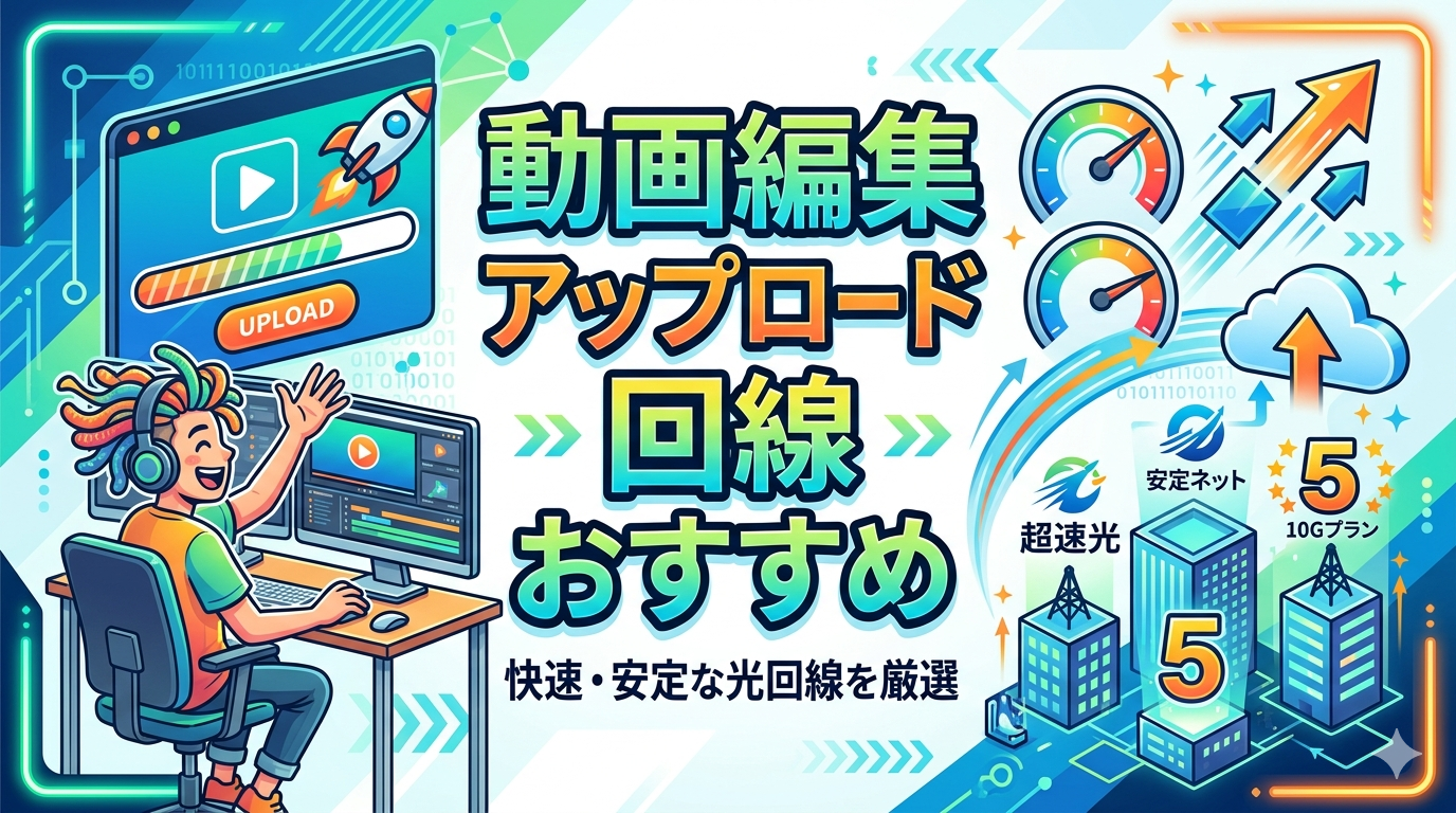 動画編集後のアップロードが遅くて作業が止まる――そんな悩みを抱えるクリエイターやYouTuberの方に向けて、上り速度の実測値・料金・安定性を徹底比較し、本当におすすめできる光回線5社を厳選しました。結論から言えば、動画編集者には「上り速度が速い独自回線」かつ「10ギガプラン対応」の光回線が最適です。