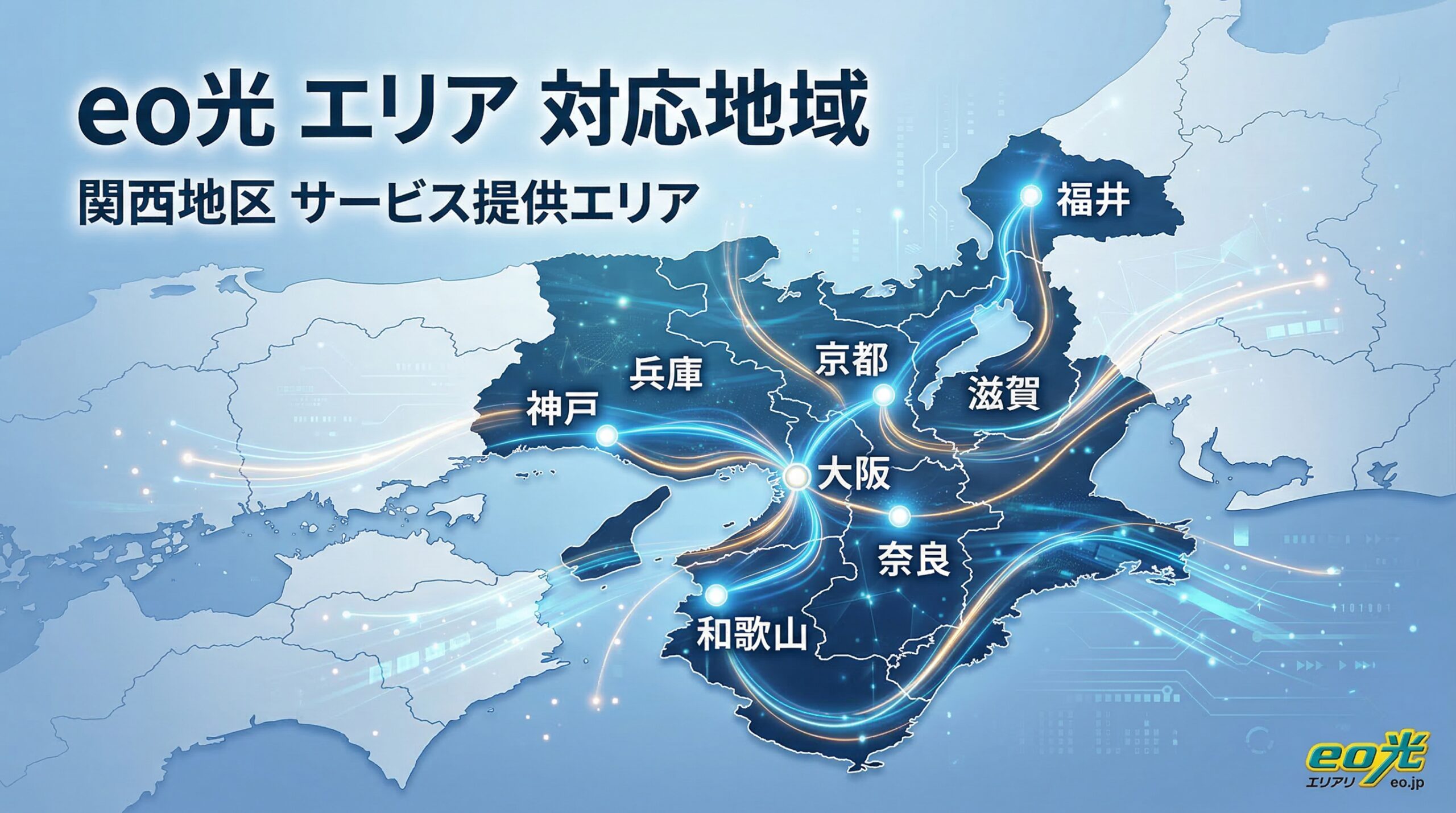 eo光の提供エリアは、大阪府・京都府・兵庫県・奈良県・滋賀県・和歌山県の関西2府4県と、福井県の一部(嶺南地域の小浜市・大飯郡高浜町・大飯郡おおい町・三方上中郡若狭町など)です。関西電力の送配電エリアに準じた地域で利用できますが、同じ市区町村内でも一部利用できない住所があるため、契約前に公式サイトでエリア確認が必要です。