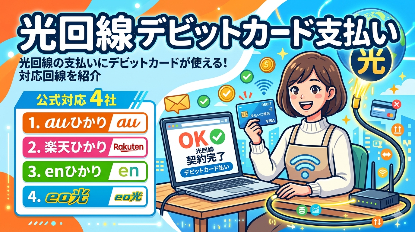 デビットカード払いに公式対応している光回線は「auひかり」「楽天ひかり」「enひかり」「eo光」の4社です。クレジットカードを持っていない方や、即時引き落としで家計管理をしたい方にとって、これらの光回線は有力な選択肢となります。