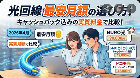 2026年4月時点で光回線の最安月額を探すなら、キャッシュバック込みの実質月額で比較することが絶対条件です。月額料金だけを見ると損をする可能性が高く、実質月額ではNURO光(戸建て)が最安、縛りなし・全国対応ではGMOとくとくBB光とドコモ光が最有力候補となっています。