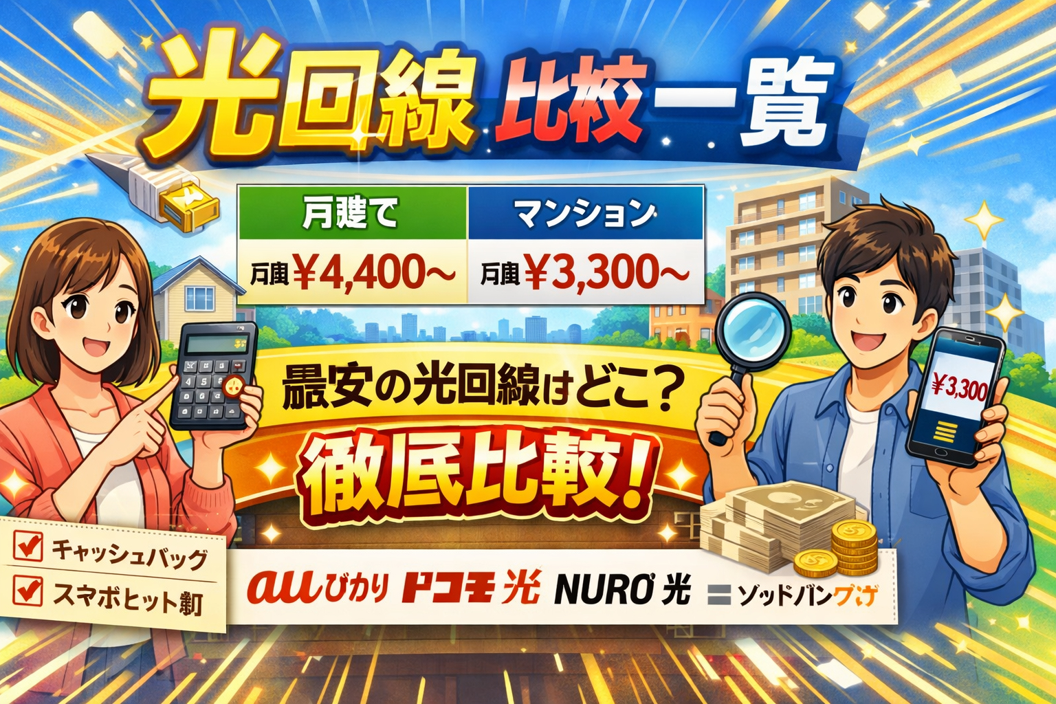 光回線の月額料金を一覧で比較したい方へ。結論から言えば、戸建ては月額4,400円台〜、マンションは3,300円台〜が相場ですが、キャッシュバックやスマホセット割を含めた「実質月額」で比較すると、あなたにとっての最安回線は大きく変わります。本記事では主要25社の料金を戸建て・マンション別に一覧表で掲載し、本当にお得な1社がわかるよう徹底比較しました。