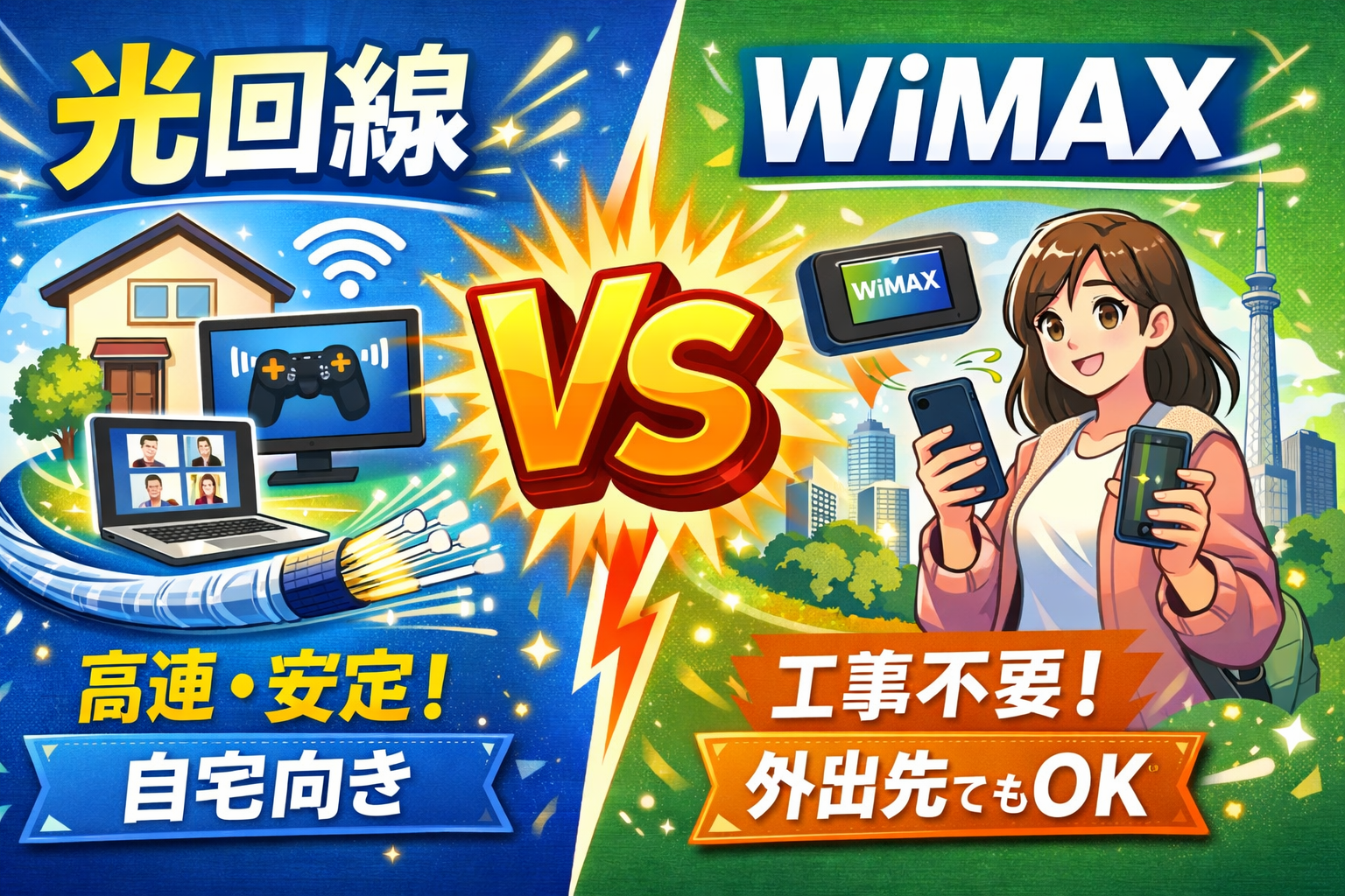 光回線とWiMAX、どっちを選ぶべきか迷っている方へ結論をお伝えします。自宅で安定した高速通信を求めるなら光回線、工事不要で手軽に使いたい・外出先でも使いたいならWiMAXがおすすめです。この記事では2026年2月最新の料金・速度・キャンペーンを7項目で徹底比較し、あなたにぴったりの回線を提案します。