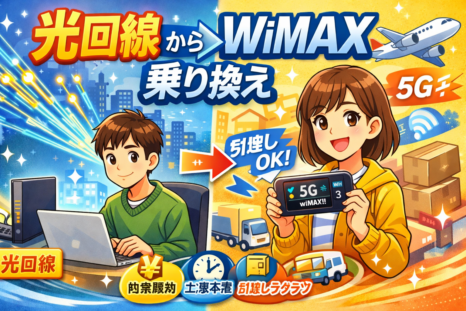 光回線からWiMAXへの乗り換えを検討中の方へ。結論から言えば、一人暮らしや引っ越しが多い方、月額料金を抑えたい方にとって、WiMAXへの乗り換えは有力な選択肢です。本記事では、料金・速度・手順・注意点を網羅的に解説し、後悔しない乗り換え判断をサポートします。
