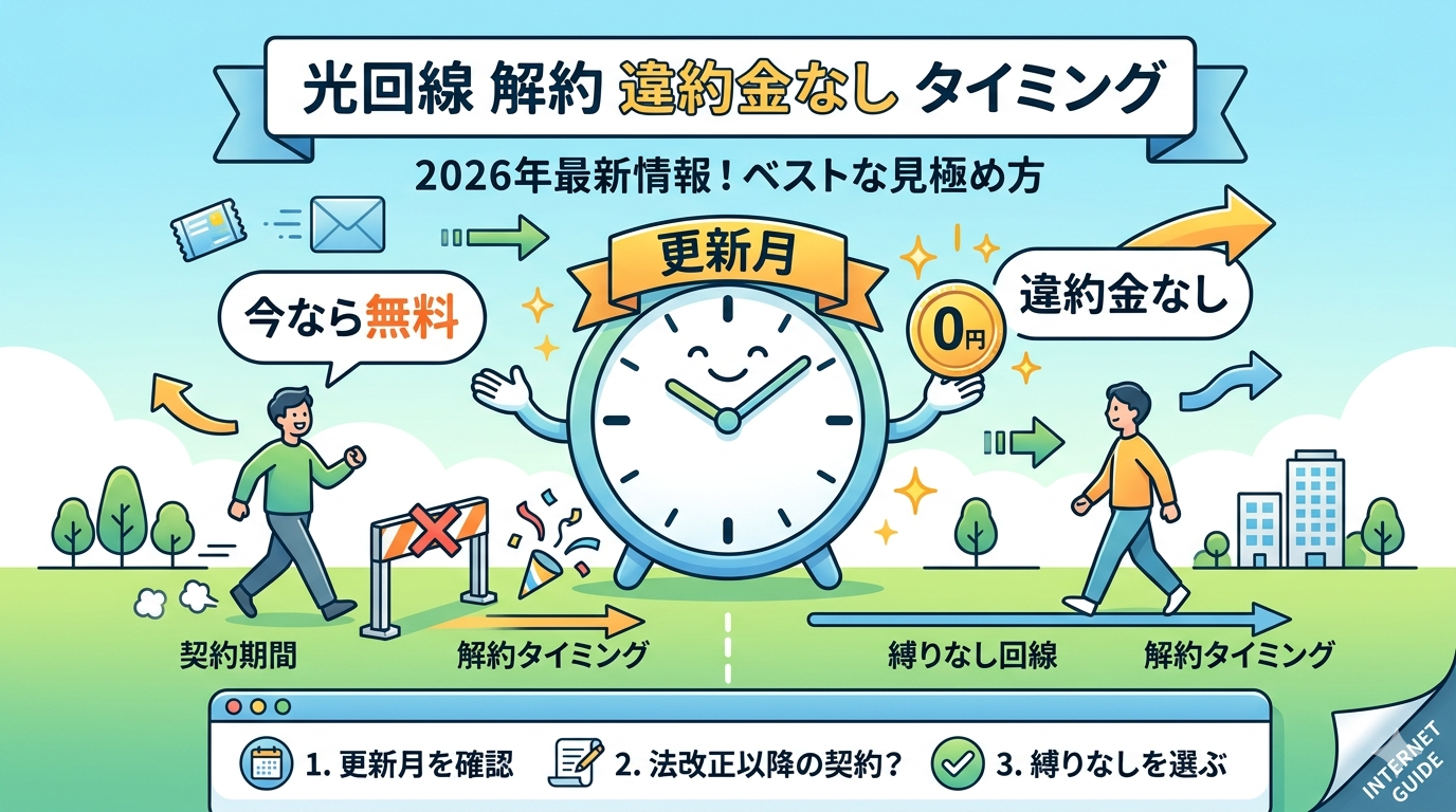 光回線を解約したいけれど、違約金が心配で踏み切れない——そんな方に向けて、違約金0円で解約できるベストタイミングの見極め方と、万が一タイミングを逃した場合の負担軽減策を2026年最新情報で徹底解説します。