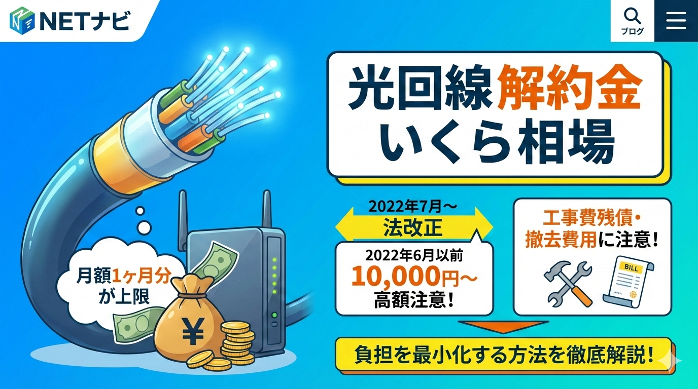 光回線の解約金は、2022年7月の法改正により「月額料金1ヶ月分が上限」となりました。ただし実際には契約解除料だけでなく、工事費残債や撤去費用なども発生するため、総額では数万円に達するケースもあります。この記事では主要12社の解約金を一覧比較し、負担を最小化する方法まで徹底解説します。