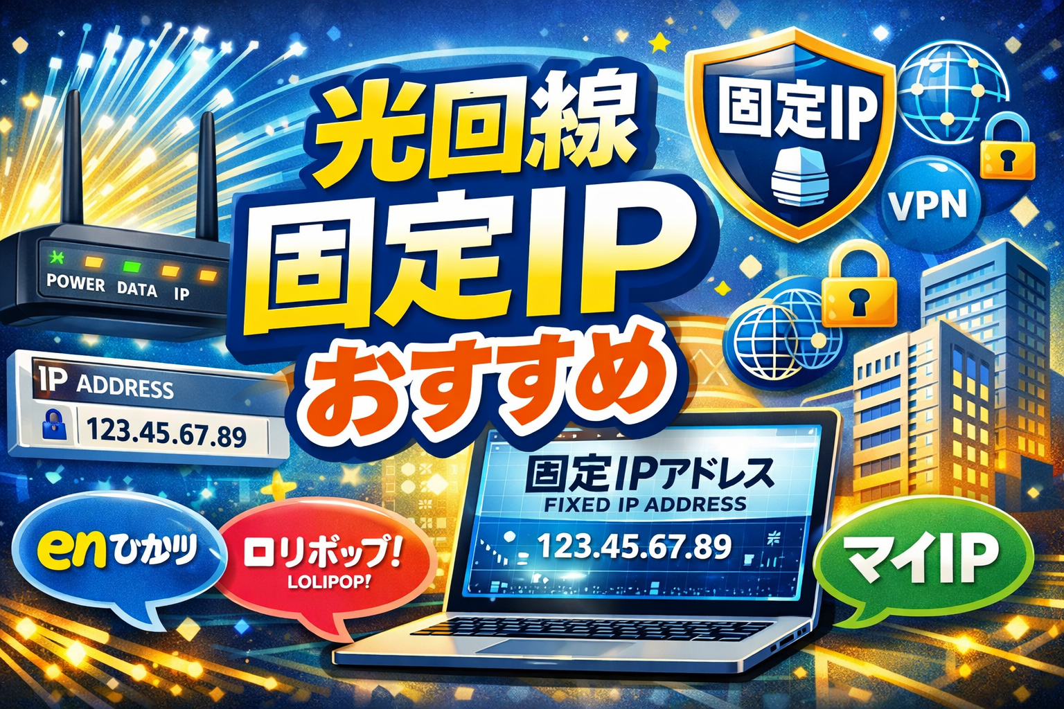 光回線で固定IPアドレスを使いたいなら、enひかり(月額770円で固定IP追加)が総合力でイチオシです。IPoE対応・10ギガ対応・縛りなしと三拍子揃い、個人から法人まで幅広くカバーします。今の回線を変えたくない方にはロリポップ固定IPアクセス(月額539円〜)やインターリンク マイIP(月額1,100円)がVPN型で即日導入可能です。