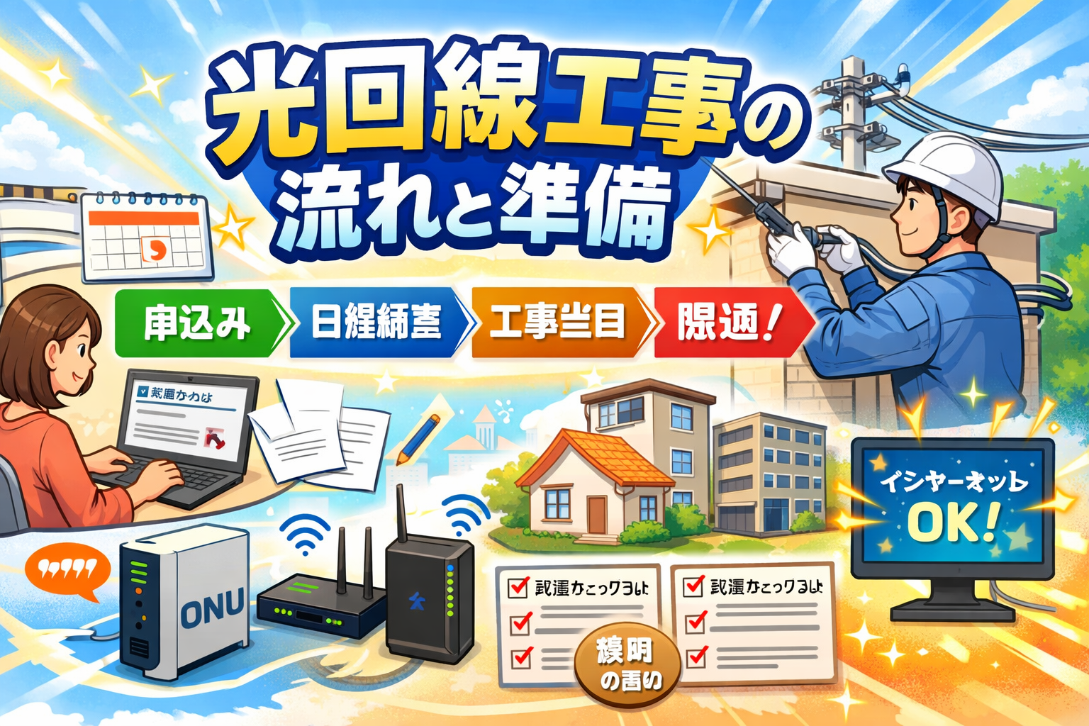 光回線の開通工事は「申し込み→工事日調整→工事当日→開通」の4ステップで完了します。本記事では、2026年最新の情報をもとに、工事の全体フロー・事前準備チェックリスト・費用相場・住居タイプ別の注意点まで徹底解説します。