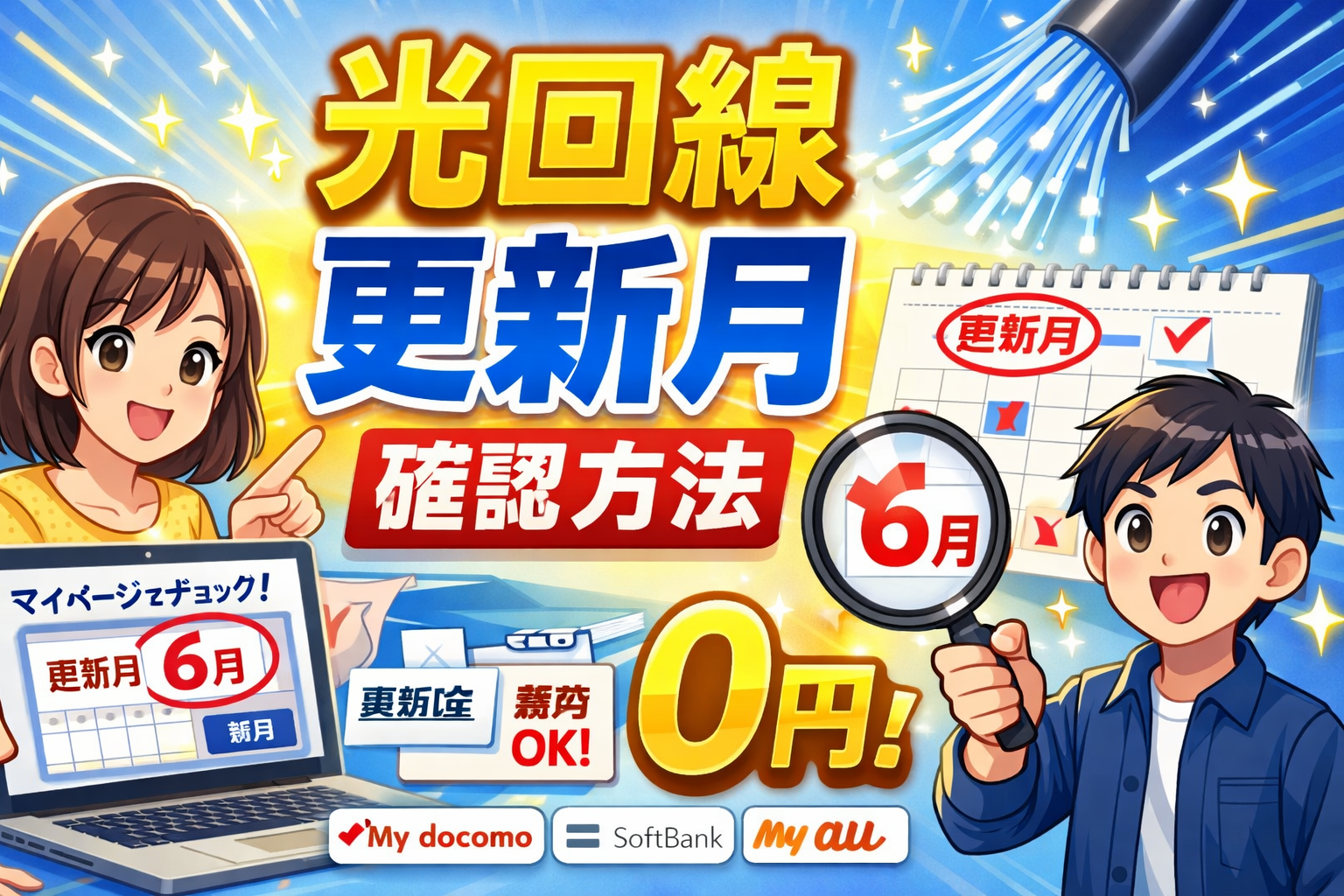 光回線の更新月は、各社マイページから最短3分で確認できます。更新月を把握しておけば違約金0円で解約・乗り換えが可能になるため、契約中の回線の確認手順を今すぐチェックしましょう。この記事では主要6社別の確認方法、違約金一覧、更新月を逃した場合の対処法まで徹底解説します。