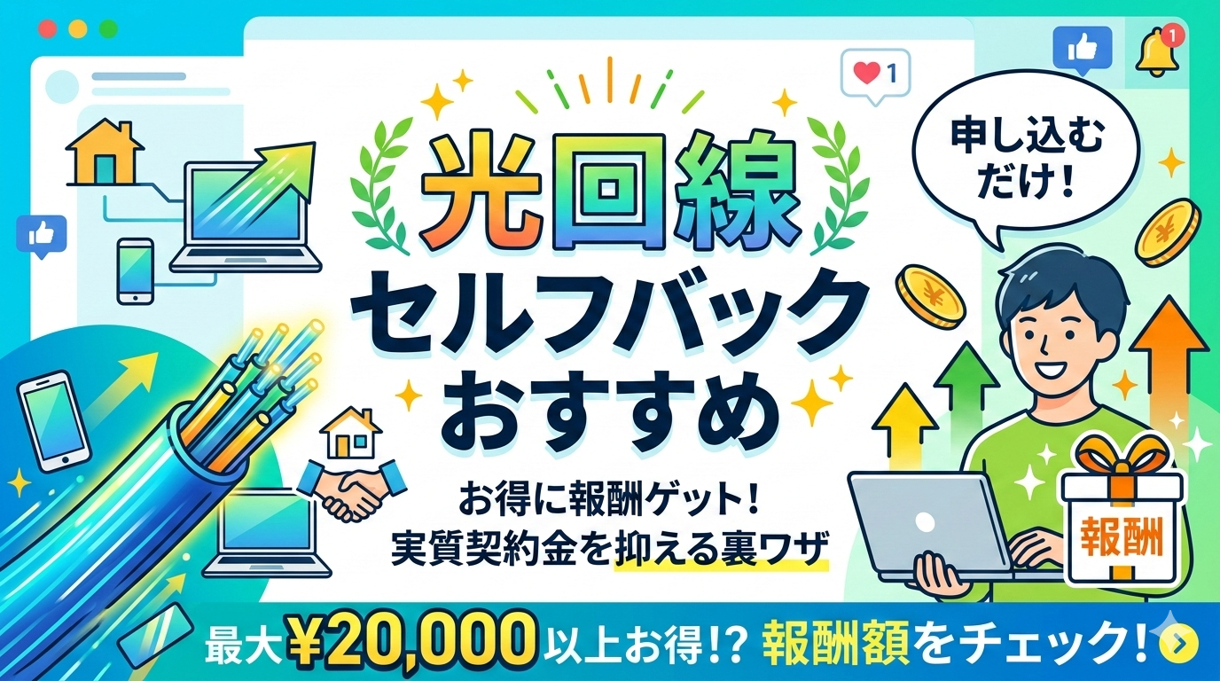光回線は毎月の固定費として長期間支払い続けるものだからこそ、契約時に受け取れる報酬は最大化しておきたいところです。セルフバックを上手に活用して、賢くお得に光回線を契約しましょう。【2026年2月最新】光回線の乗り換えおすすめ10選|キャッシュバック・違約金負担で損しない選び方もあわせて参考にしてみてください。