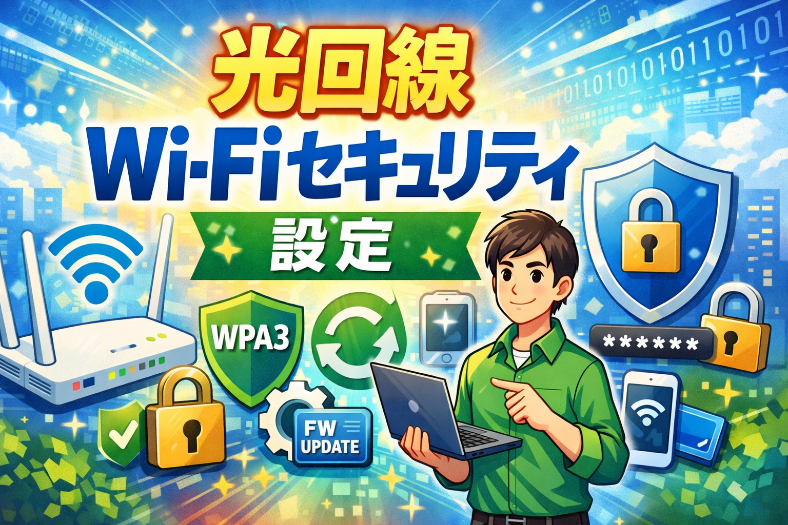 光回線のWi-Fiセキュリティは、暗号化方式をWPA3(またはWPA2-PSK(AES))に設定し、ルーターの管理パスワード変更・ファームウェア更新・接続デバイスの定期確認を行うことで、不正アクセスやタダ乗りのリスクを大幅に低減できます。Wi-Fi 7時代ではWPA3が必須要件となっており、今すぐ設定を見直すことをおすすめします。