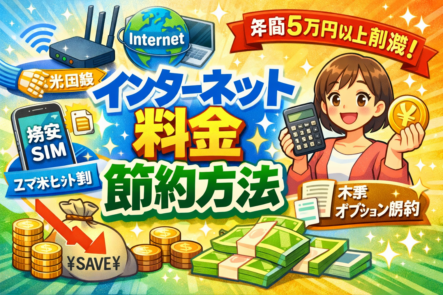 毎月のインターネット料金を節約するには、「光回線の見直し」「スマホセット割の活用」「格安SIMへの乗り換え」「不要オプションの解約」の4つを組み合わせることが最も効果的です。この記事では、2026年最新の料金データと口コミをもとに、年間5万円以上の通信費削減を実現する具体的な方法を徹底解説します。