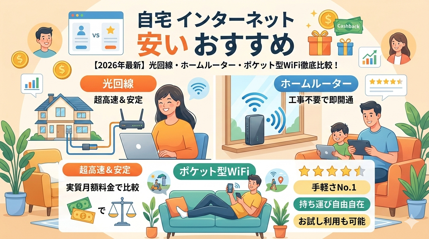 【2026年2月最新】自宅インターネットが安いおすすめ回線7選|光回線・ホームルーター・ポケット型WiFiを徹底比較