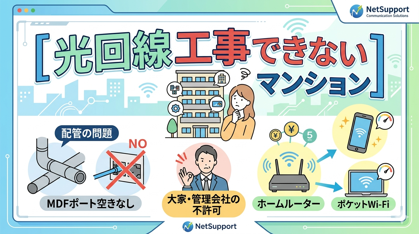 マンションで光回線の工事ができないと言われた場合、その原因は大きく5つに分けられます。しかし、光回線が引けなくてもインターネット環境を整える方法はあります。この記事では工事不可の原因を一つずつ解説し、ホームルーターをはじめとする代替手段の料金・速度を比較して最適な解決策をお伝えします。