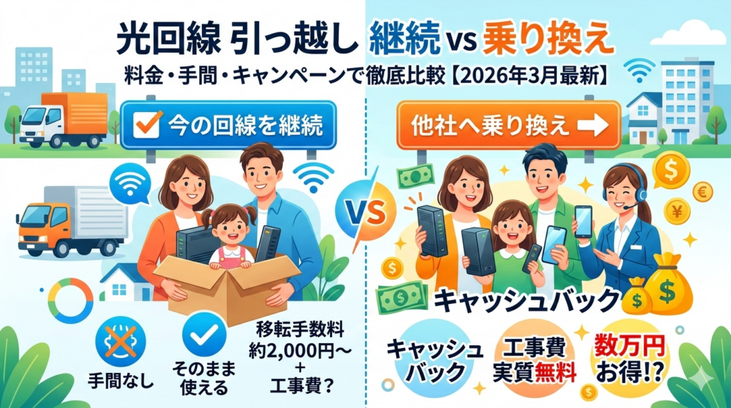 光回線の引っ越しは「継続」と「乗り換え」どっちがお得?料金・手間・キャンペーンで徹底比較【2026年3月最新】 引っ越しが決まったとき、今使っている光回線をそのまま移転して継続すべきか、それとも解約して他社に乗り換えるべきか迷う方は多いのでは... -