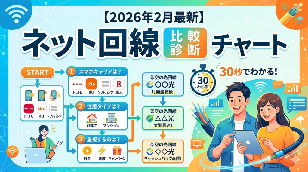 【2026年2月最新】ネット回線比較診断チャートで最適な光回線が30秒でわかる!料金・速度・キャンペーン別おすすめ完全ガイド 「自分にぴったりのネット回線がわからない」「比較サイトを見ても結局どれがいいのか決められない」とお悩みではありませんか... -