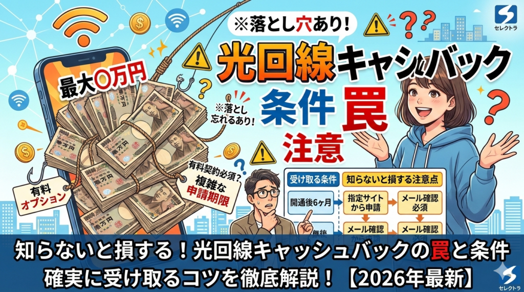 光回線キャッシュバックの罠と条件|知らないと損する5つの注意点と確実に受け取るコツ【2026年2月最新】 光回線のキャッシュバックは「最大○万円」という広告に目を引かれがちですが、実際には複雑な適用条件や申請期限の罠が潜んでおり、受け取れなかっ... -