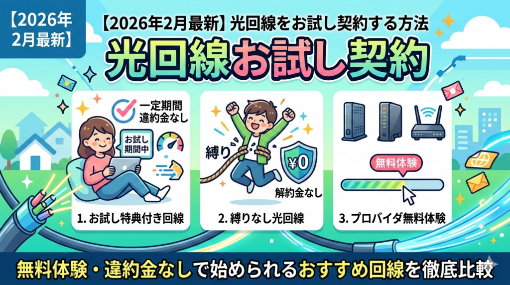 【2026年2月最新】光回線をお試し契約する方法|無料体験・違約金なしで始められるおすすめ回線を徹底比較 光回線を契約したいけれど、「速度に満足できなかったらどうしよう」「すぐに解約すると違約金が心配」と悩んでいませんか。実は、お試し感覚で契... -