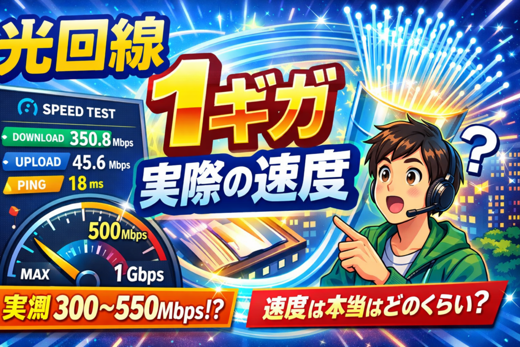 光回線の「最大1Gbps」は、実際に使ってみると平均300〜550Mbps程度です。本記事では、主要6社の実測データ・時間帯別の速度差・建物種別ごとの違いを徹底解説し、1ギガで十分なのか、速度が遅い場合の具体的な改善方法まで網羅的にお伝えします。 光回線1... -