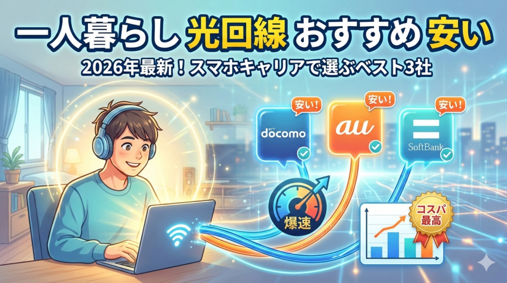 一人暮らしで光回線を検討中の方へ。結論から言うと、スマホキャリアや住居タイプによって最安の光回線は異なります。本記事では2026年2月最新の料金・速度・キャンペーンを徹底比較し、あなたにぴったりの1社が見つかる選び方とおすすめ光回線を紹介しま... -
