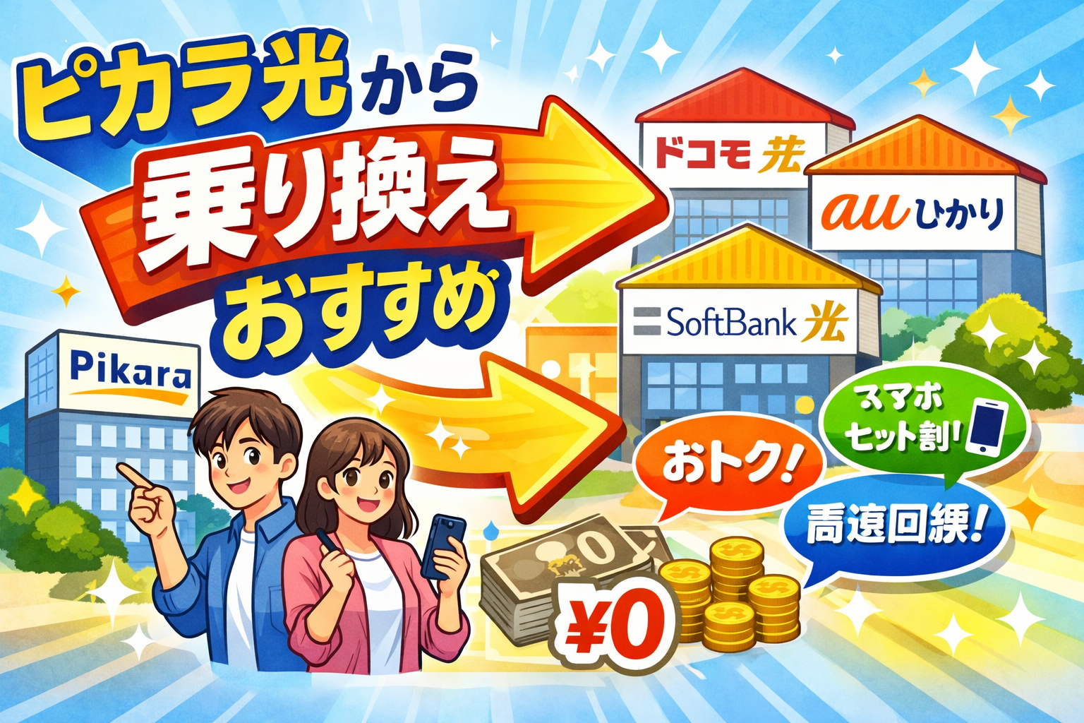 ピカラ光は四国エリアで人気の光回線ですが、「引っ越しでエリア外になる」「スマホとのセット割が合わない」「もっと安い回線に変えたい」といった理由で乗り換えを検討している方も多いのではないでしょうか。結論から言えば、ピカラ光からの乗り換え先は、お使いのスマホキャリアに合わせて選ぶのが最もお得です。