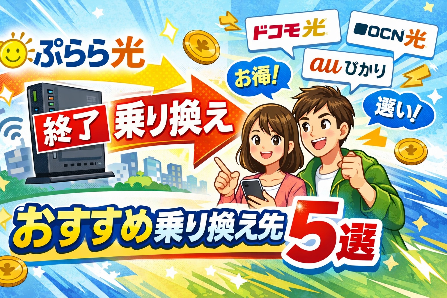 ぷらら光は2026年5月から順次「ドコモ光」と「OCNインターネット」へサービス統合されることが決定しました。自動移行を待つとキャッシュバックなどの特典が受けられないため、サービス統合前に自分で乗り換え手続きを済ませるのが最もお得です。この記事では、ぷらら光からの乗り換え先おすすめ5社を料金・速度・キャンペーン別に比較し、失敗しない乗り換え手順を解説します。