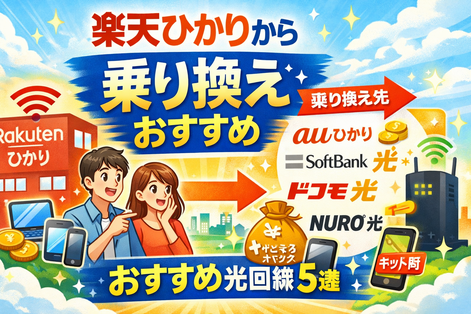 楽天ひかりから乗り換えを検討中の方に結論からお伝えすると、「事業者変更」で光コラボに乗り換えるのが最もお得で簡単です。スマホとのセット割やキャッシュバックを活用すれば、通信費を年間数万円単位で節約できます。本記事では、2026年3月時点の最新情報をもとに、おすすめの乗り換え先を5社厳選して徹底比較します。