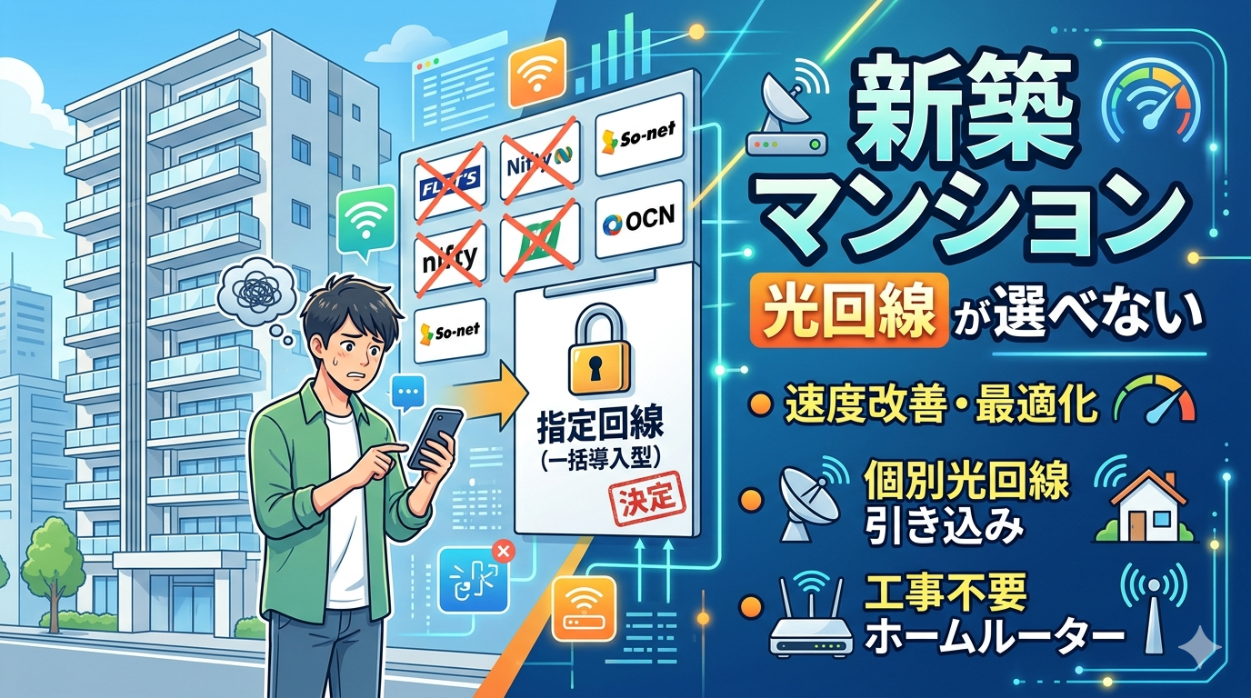 新築マンションに入居したのに「光回線が自由に選べない」と困っていませんか?実は新築マンションの多くはデベロッパーが一括導入型の指定回線を契約済みで、入居者が自分で光回線を選ぶことができません。本記事では、選べない理由・仕組みから、速度が遅い場合の具体的な改善策・代替手段まで徹底的に解説します。
