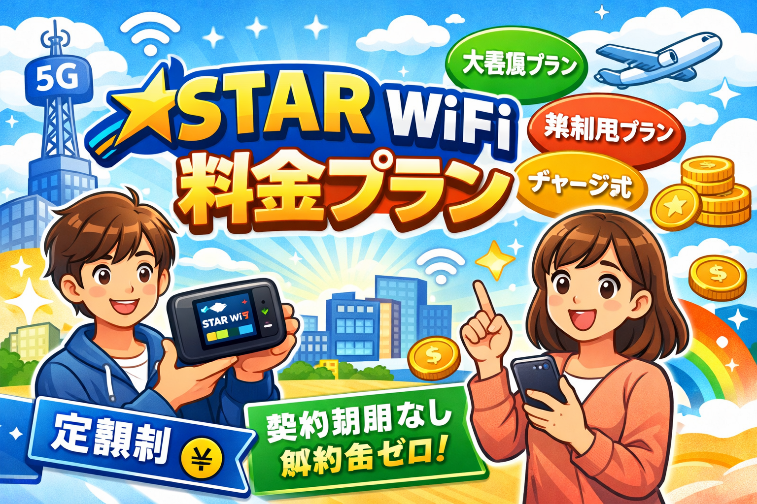 STAR WiFiは、契約期間の縛りなし・解約金なしで使えるポケット型WiFiサービスです。定額制の「新大容量プラン」「無制限プラン」に加え、チャージ式の「STARチャージWi-Fi」も展開しており、自分の使い方に合わせてプランを選べます。本記事では、2026年2月時点の最新料金プラン・初期費用・メリットとデメリット・口コミ評判を徹底的に解説し、他社ポケット型WiFiとの比較も交えて「STAR WiFiは本当にお得なのか」を検証します。