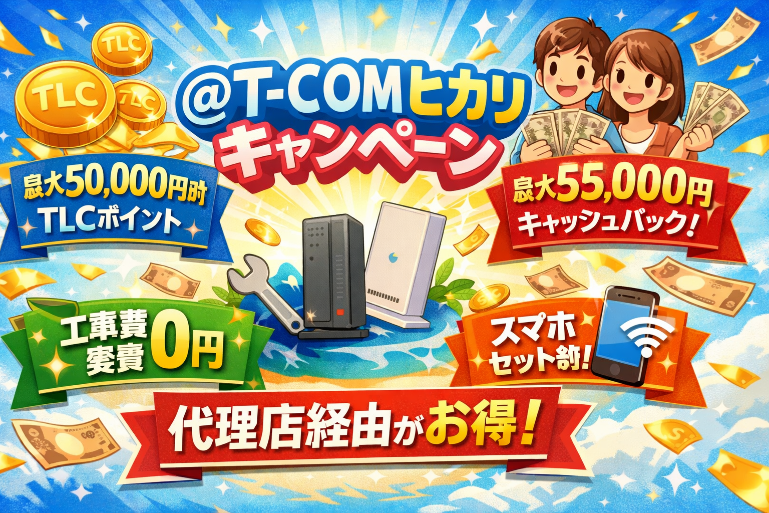 @T-COMヒカリは2026年3月現在、最大50,000円相当のTLCポイント進呈に加え、代理店経由なら最大55,000円の現金キャッシュバック、工事費実質無料、スマホセット割など複数のキャンペーンを実施中です。この記事では、公式・代理店を含む全特典の内容と、もっともお得に申し込む方法を詳しく解説します。